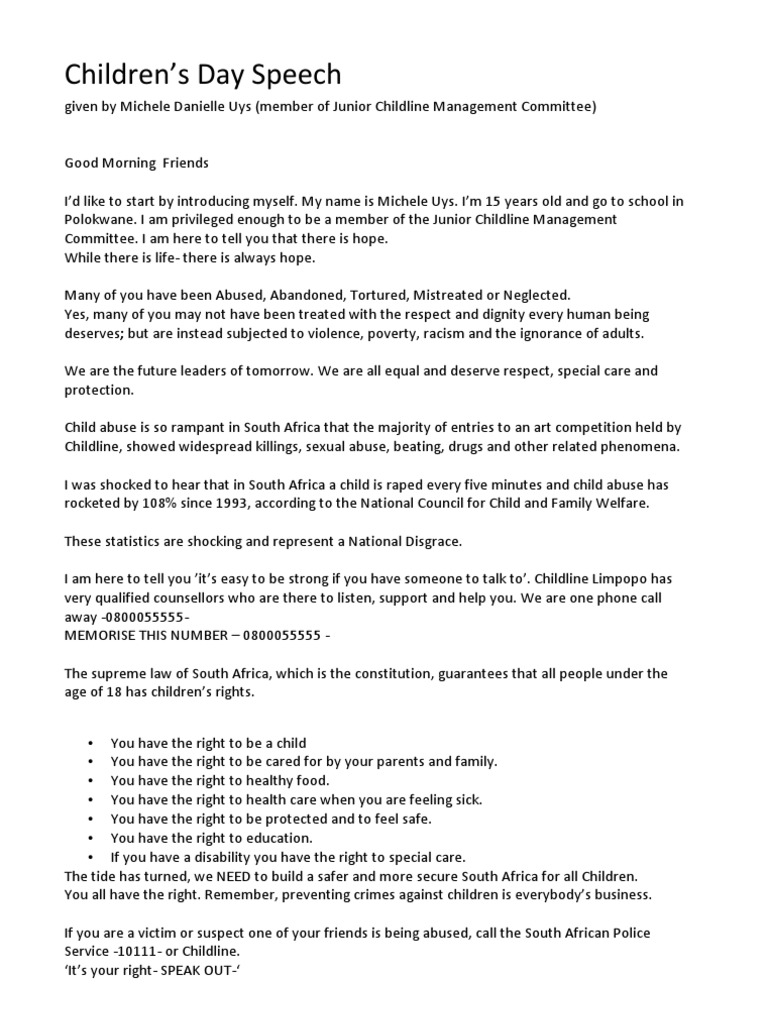 Children's day speech would be a great opportunity to emphasise on. A speech on children's day is an item of words which is needed by most of the students and children, as it is a topic of full awareness and interest, so here, is an essay in very simple and applicable. Below we have provided children's day speech in english, suitable for class 6, 7, 8, 9 and 10. Speeches are made by eminent educationists including schools'. Speech on childrens day i am to give a five minute speech on children's day in a school.
